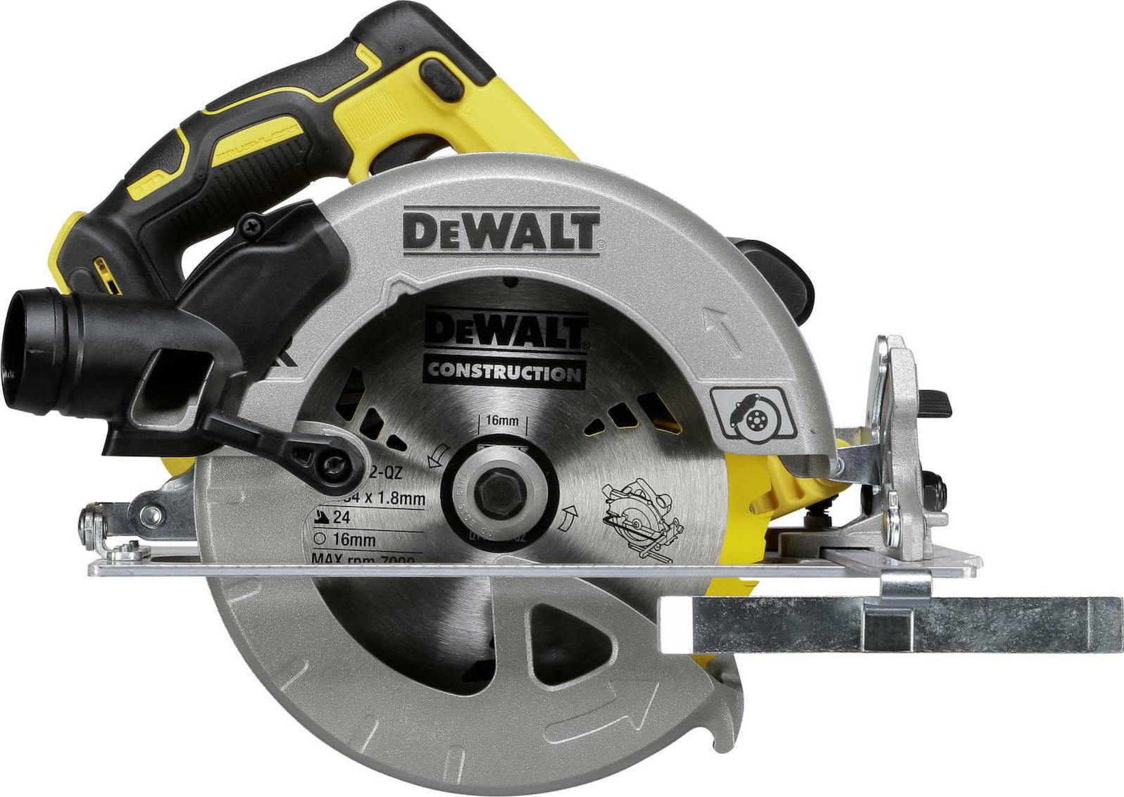 Δισκοπρίονο από τον κατασκευαστή Dewalt, με λειτουργία μπαταρίας 18V (δεν περιλαμβάνεται). Χρησιμοποιείται για κοπή ξύλου σε ευθεία γραμμή. Διαθέτει κινητήρα με μέγιστη ταχύτητα 5500rpm και τεχνολογίας brushless που ενισχύει την αντοχή και την διάρκεια λειτουργίας του εργαλείου. Επίσης, μπορεί να συνδεθεί με σύστημα αναρρόφησης το οποίο βοηθάει στη συλλογή των υπολειμμάτων κατά την διάρκεια της λειτουργίας του. Δέχεται δίσκους κοπής με διαμέτρο έως 184mm και υποδοχή 16mm. Μπορεί να κόψει ξύλο έως 64mm και έως 49mm υπό γωνία 45° χάρη στην ικανότητα φαλτσοκοπής (μέγιστη κλίση 57°). Η συσκευασία περιλαμβάνει οδηγό για κοπές με ακρίβεια και σκληρή θήκη για εύκολη μεταφορά και αποθήκευση.