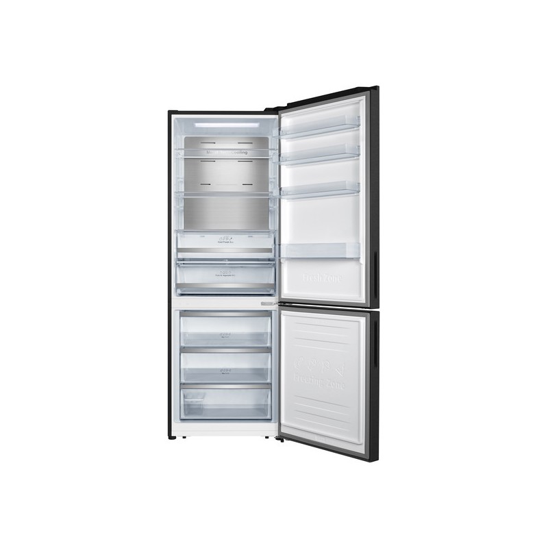 Ψυγειοκαταψύκτης Hisense με τύπο ψύξης Full No Frost, χωρητικότητα 495lt, μαύρου χρώματος, οθόνη ενδείξεων, τρία ράφια στη συντήρηση και με πλάτος 70cm.