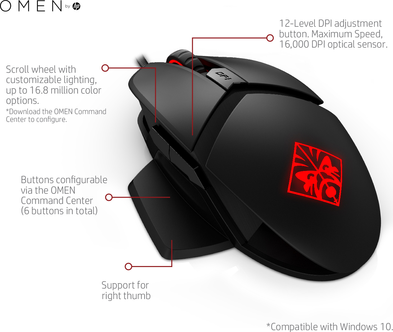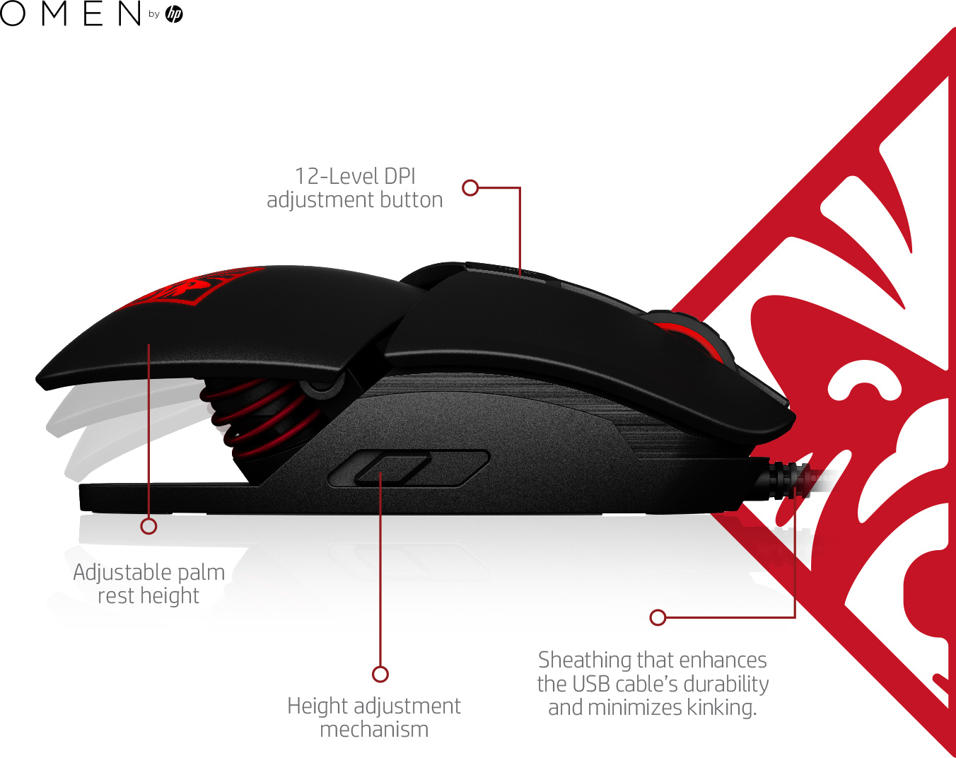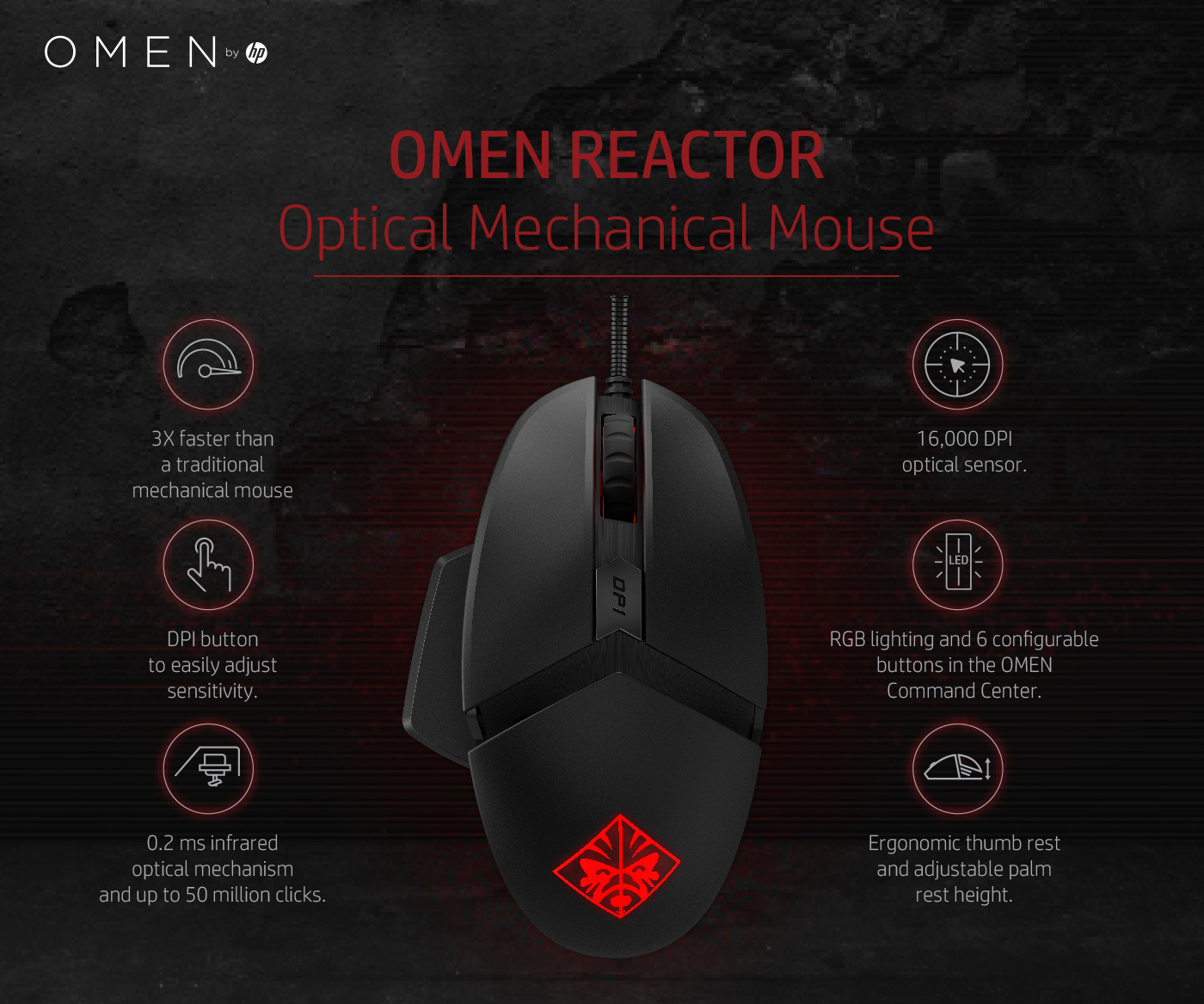 To HP Reactor είναι ένα ενσύρματο gaming ποντίκι σχεδιασμένο για δεξιόχειρες, με οπτικό αισθητήρα και ανάλυση 16000 DPI. Διαθέτει 6 κουμπιά (όλα από τα οποία μπορούν να προγραμματιστούν) και φωτισμό RGB που μπορεί να πάρει διάφορες αποχρώσεις.