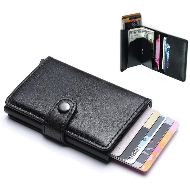 Men Automatic Credit card holder Leather Wallet Aluminum Mini Wallet Black