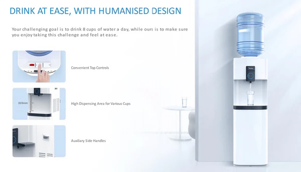 Midea ψύκτης νερού με ενσωματωμένο ψυγειάκι στο κάτω μέρος όπου μπορείτε να παγώσετε τα αναψυκτικά σας ή να δροσείετε το ποτό σας με πάγο από την παγοθήκη. Διαθέτει 3 πιεζόμενους διακόπτες για κρύο, ζεστό ή νερό σε θερμοκρασία δωματίου, λειτουργία ασφαλείας για παιδιά στον έλεγχο ζεστού νερού και δεξαμενή νερού από ανοξείδωτο χάλυβα.