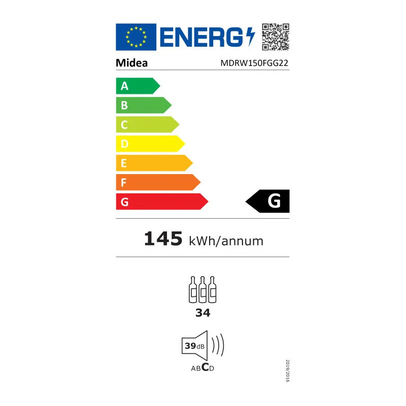 Συντηρητής κρασιών Midea MDRW150FGG22 χωρητικότητας έως 34 φιάλες, ενεργειακής κλάσης G. Διαθέτει 6 + 1 ράφια κρασιού, φίλτρο UV για να προστατεύονται τα κρασιά σας από το ανεπιθύμητο φως, φωτισμό LED για ομοιόμορφο φωτισμό και ηλεκτρονικό σύστημα ακριβή ελέγχου της θερμοκρασίας μεταξύ 5ºC-18ºC με ψηφιακή ένδειξη.
