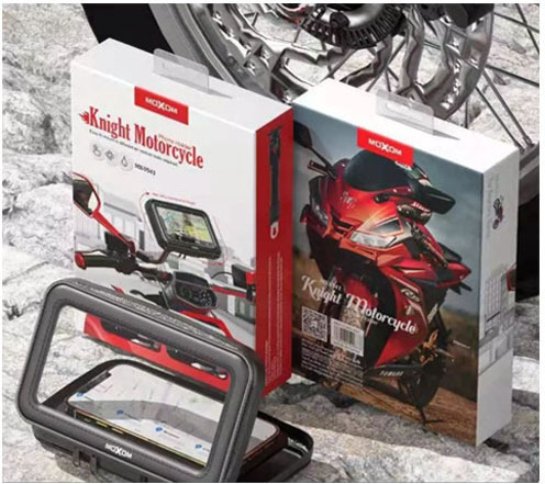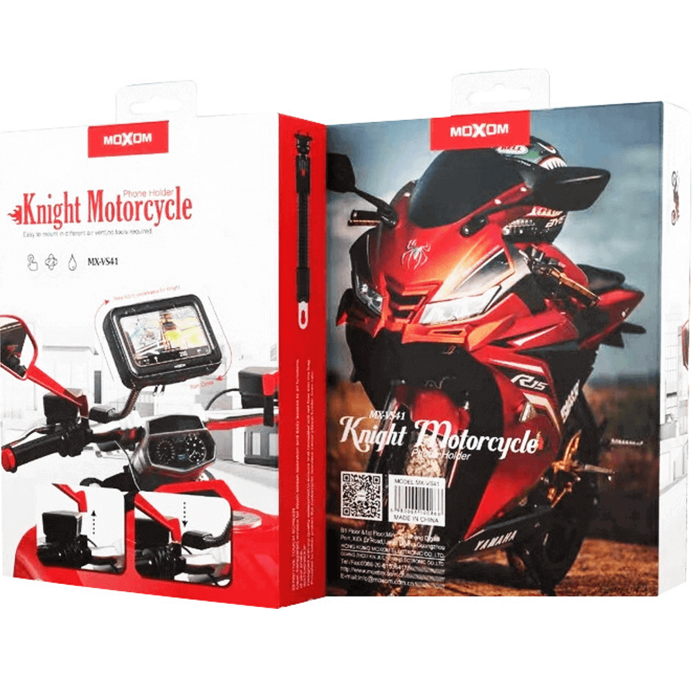 Βάση στήριξης κινητών Κινητού Moxom MX-VS41Knight για μοτοσυκλέτες. Η βάση διαθέτει υποδοχή για να τοποθετηθεί στο καθρέπτη της μοτοσυκλέτας. Η στήριξη της συσκευής στη βάση γίνεται με θήκη. Αυτό σημαίνει ότι η συσκευή είναι προστατευμένη από σταγονίδια νερού, τη σκόνη και τον αέρα. Παράλληλα, διαθέτει περιστροφή για πιο εύκολη ρύθμιση της επιθυμητής θέσης της συσκευής.