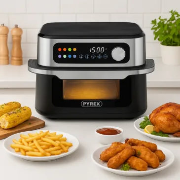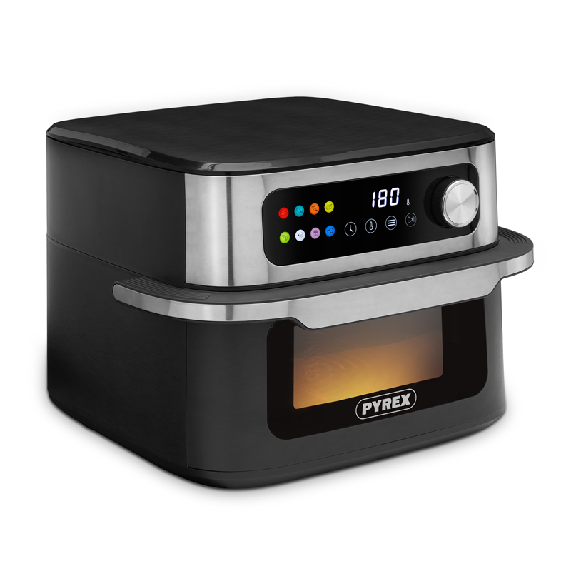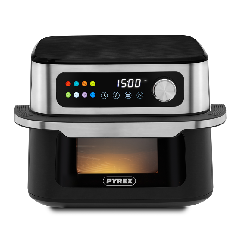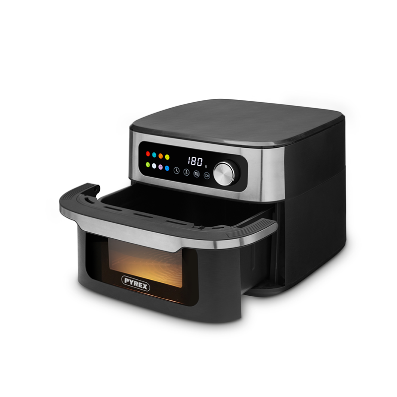 Η φριτέζα αέρος Pyrex Digital XXL είναι γρήγορη, ευπροσάρμοστη, συμπαγής και βολική ώστε να μπορείτε να τηγανίζετε με 95% λιγότερο λάδι στον αέρα, να ψήνετε και να θερμαίνετε, ενώ χάρη στην τεχνολογία Food Control μπορείτε να ελέγχετε την πρόοδο του μαγειρέματος χωρίς να ανοίγετε το καλάθι. Ο μοντέρνος σχεδιασμός που ταιριάζει σε κάθε κουζίνα διαθέτει 8 προσαρμόσιμα προγράμματα, ρυθμιζόμενη θερμοκρασία από 80°C – 200°C, εύχρηστη οθόνη αφής όπου εμφανίζει κάθε στάδιο μαγειρέματος καθώς επίσης ο χρόνος προθέρμανσης είναι ελάχιστος. Επιπλέον, ο αντικολλητικός δίσκος μαγειρέματος πλένεται στο πλυντήριο πιάτων, ενώ είναι κατάλληλη για γεύματα 7-8 ατόμων.