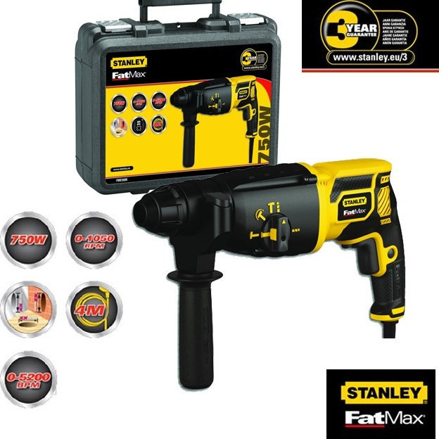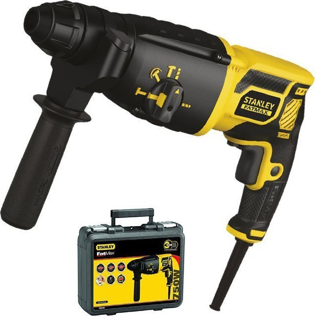 Σκαπτικό ρεύματος της εταιρείας Stanley με ισχύ 750Watt και μήκος καλωδίου 4m. Διαθέτει λειτουργία κρούσης για καλέμισμα σε διάφορα δομικά υλικά, λειτουργία περιστροφής χωρίς κρούση για διάτρηση σε χαμηλής σκληρότητας υλικά και δυνατότητα περιστροφής με κρούση για διάτρηση σε υψηλής σκληρότητας υλικά όπως μπετόν. Επίσης, διαθέτει υποδοχή SDS – SDS Plus (TE-C) για καλύτερη απόδοση σε λειτουργίες περιστροφής με κρούση συγκριτικά με τις υπόλοιπες (ενδείκνυνται για εργασία σε μπετό ή πέτρα) και εύκολη αλλαγή τρυπανιών που μπορεί να γίνει ακόμη και με το ένα χέρι. Ακόμη, έχει δυνατότητα λειτουργίας βιδώματος/ξεβιδώματος.