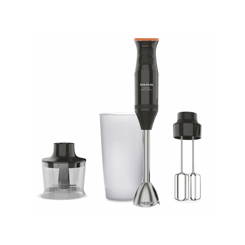 The Bapi 1200 Rocket Complet hand blender by Taurus combines 1200W of power, 20 speeds, and a Turbo function for precise results. Its double emulsifier is perfect for baking, allowing you to prepare flawless creams, meringues, and doughs. With Turbo Rotation System and stainless steel blades, it crushes ice and mixes effortlessly. It includes a measuring cup, chopper, and dishwasher-safe accessories, ensuring convenience and easy cleaning. Designed for versatile recipes with professional finishes in the kitchen.