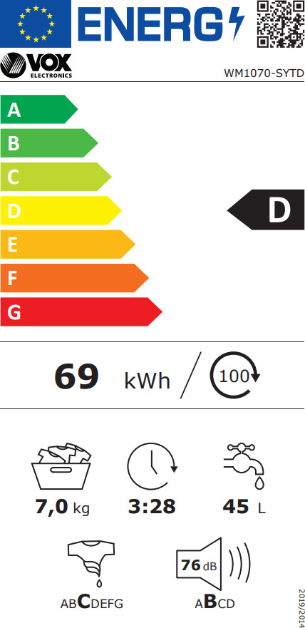 Είναι ενεργειακής κλάσης D, που σημαίνει ότι προσφέρει συνολικά λίγο μεγαλύτερη κατανάλωση, σε σχέση με τα υπόλοιπα πλυντήρια ρούχων ενεργειακής κλάσης από C και πάνω.